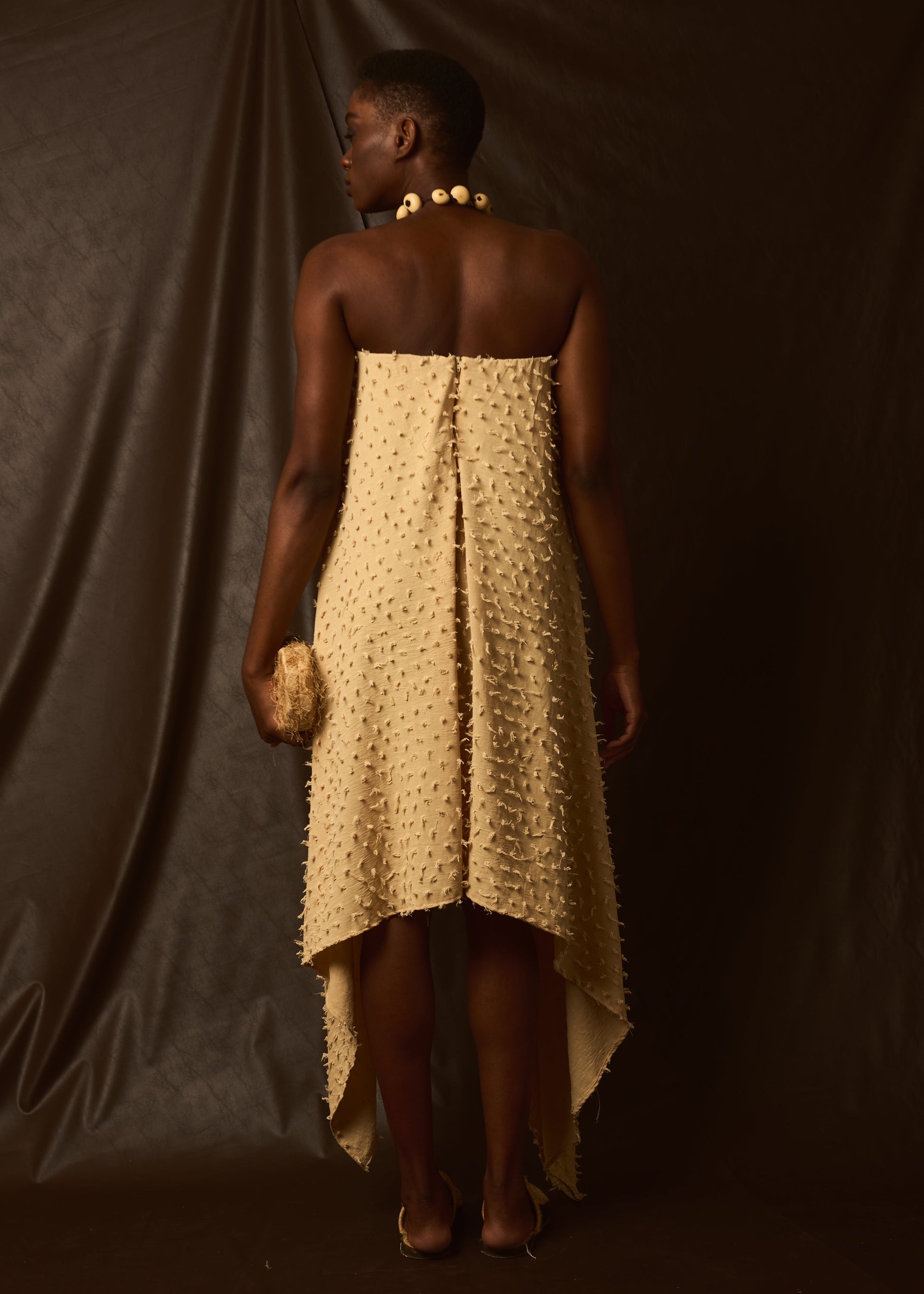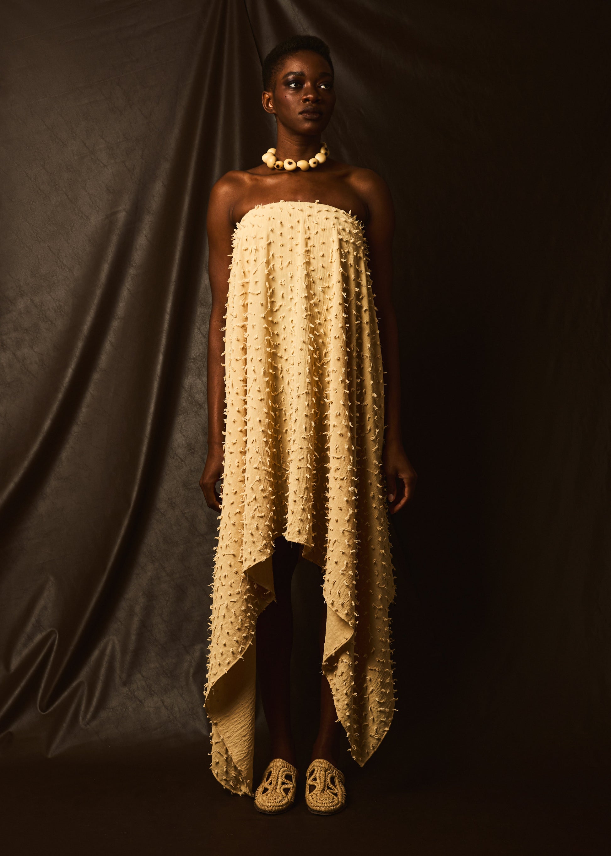 Confeccionada em poliéster com textura tridimensional. O caimento assimétrico cria uma leveza e envolvimento, enquanto a superfície detalhada traz um toque sensorial único, convidando ao toque e ao olhar. Uma peça que atravessa graças, feita para quem deseja vestir arte e movimento.