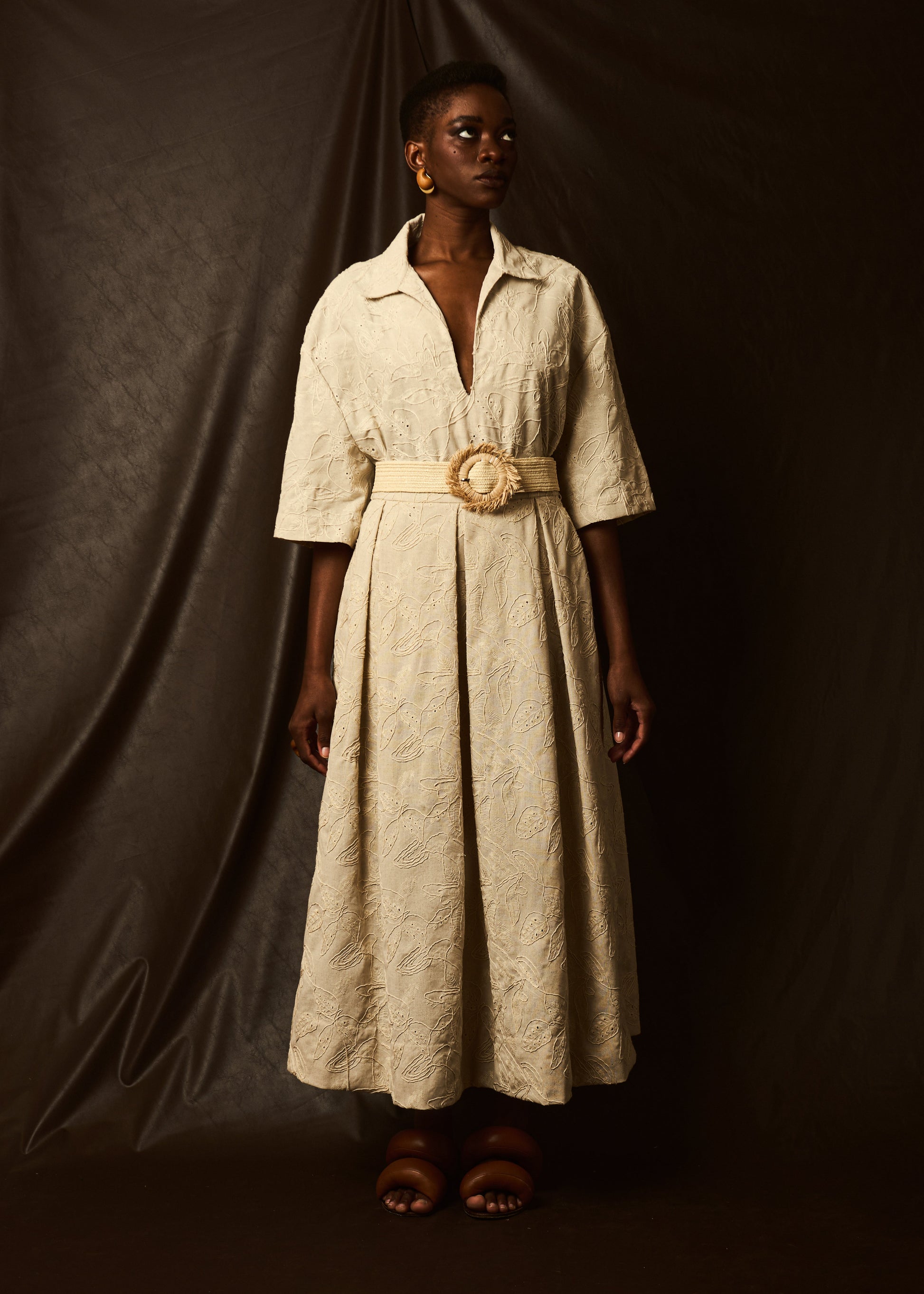 Confeccionada em tecido com padronagem bordada, a Saia Catavento apresenta pregas que estruturam o caimento e realçam o movimento do corte amplo. Versátil e confortável, é uma peça que acompanha diferentes ocasiões com naturalidade.