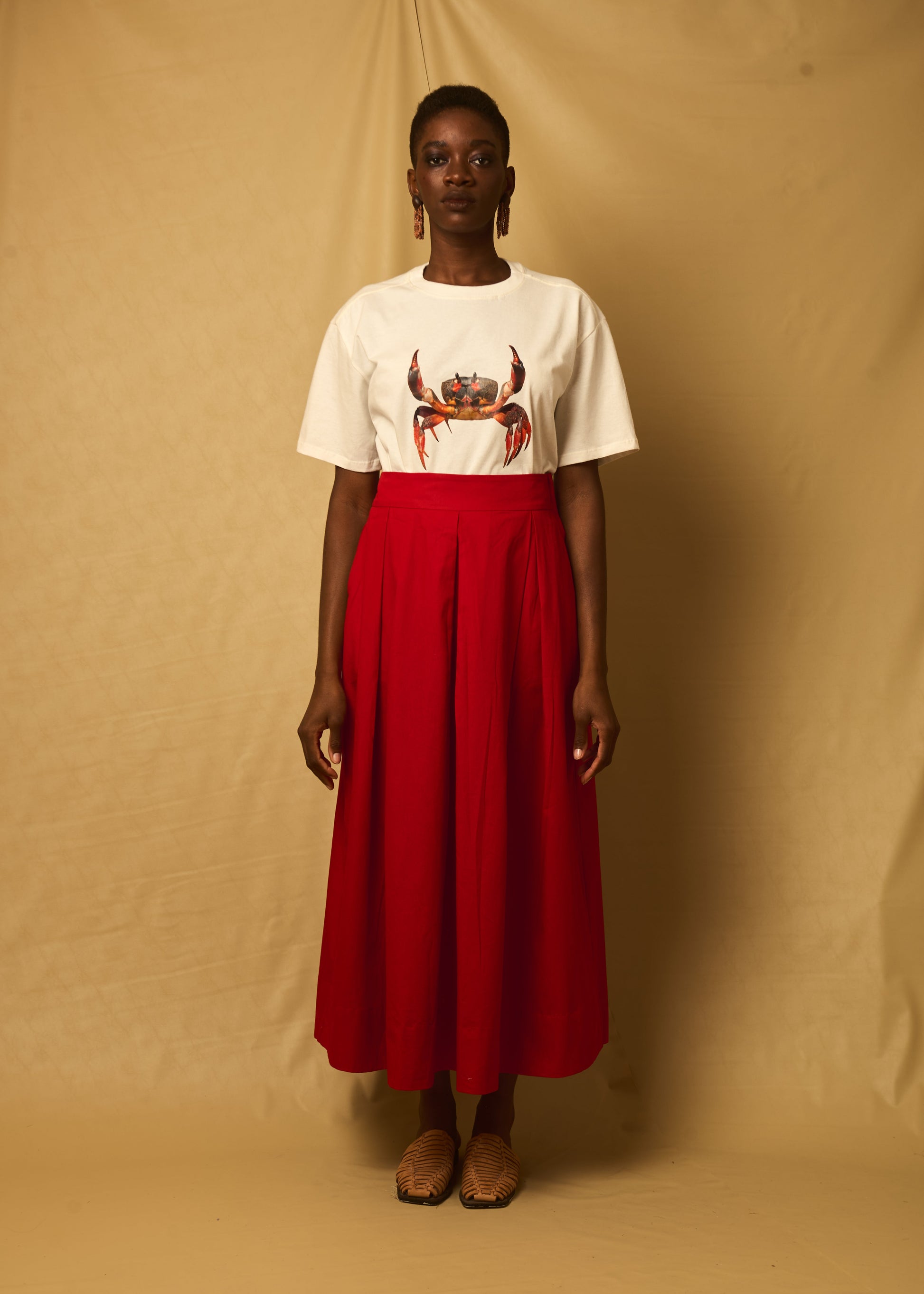 A Saia Catavento, em vermelho intenso, tecido 100% algodão, traz movimento geométrico e marcante. O corte amplo garante fluidez ao caminhar, criando uma sensação de leveza que acompanha cada passo.
