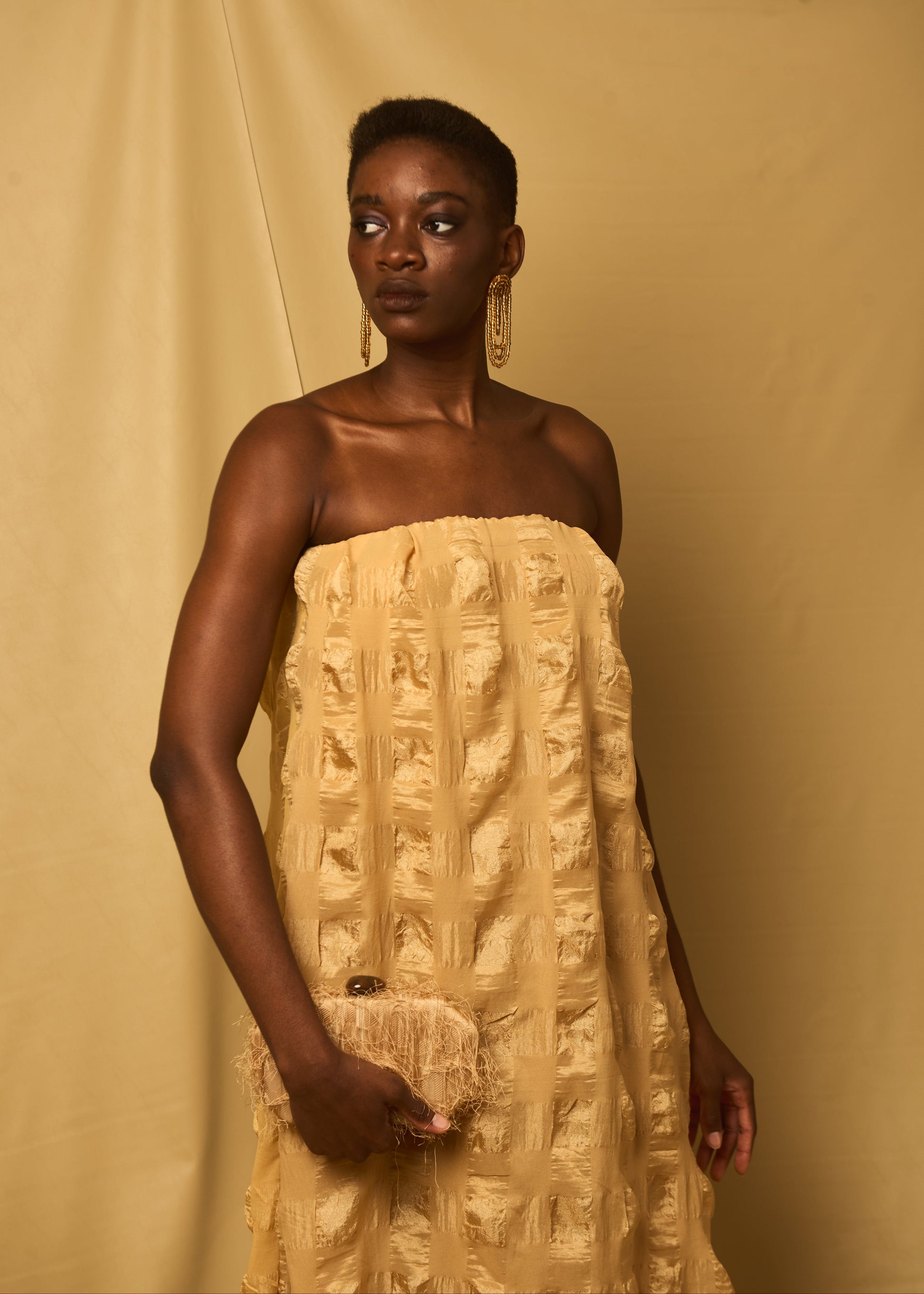 Confeccionado em tecido de composição 100% poliéster com textura marcada em relevo. De modelagem reta e tomara que caia, traduz leveza e imponência em uma só peça. O efeito tátil do tecido cria profundidade e movimento, reforçando sua presença marcante em qualquer ocasião.