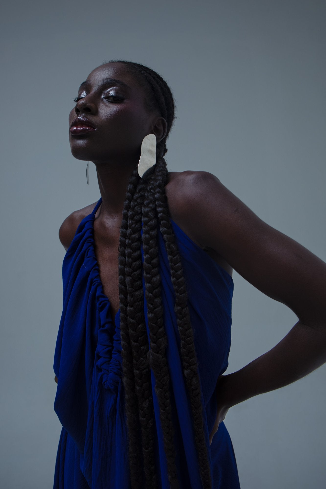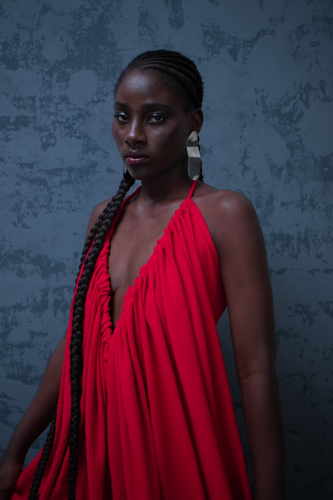 Vestido em crepe com decote em formato V na parte frontal formando um leve drapeado e uma modelagem leve e fluida.
